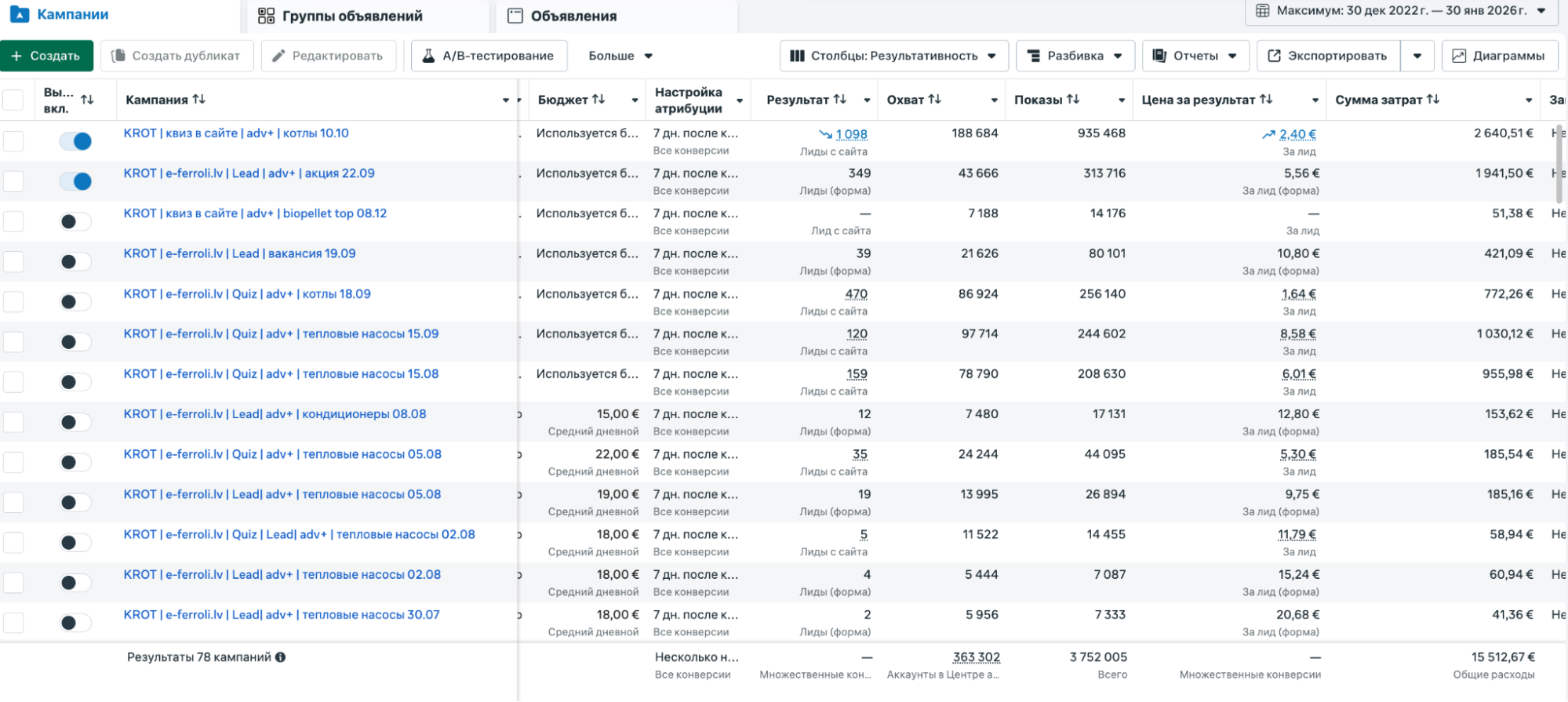 Запущенные рекламные кампании Lead Generation + Purchase + Traffic