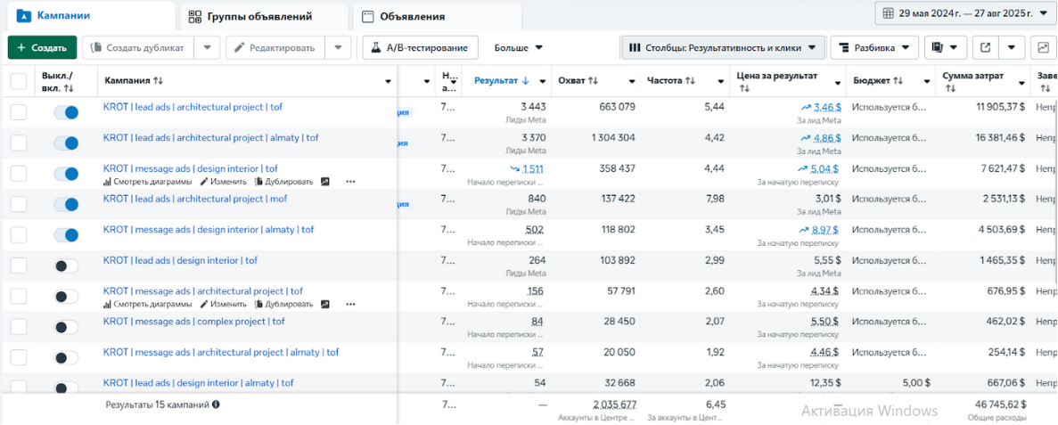 🔴 Запущены и оптимизированы кампании PMax на две аудитории (ключевые слова и аудитория конкурентов) для получения лидов;