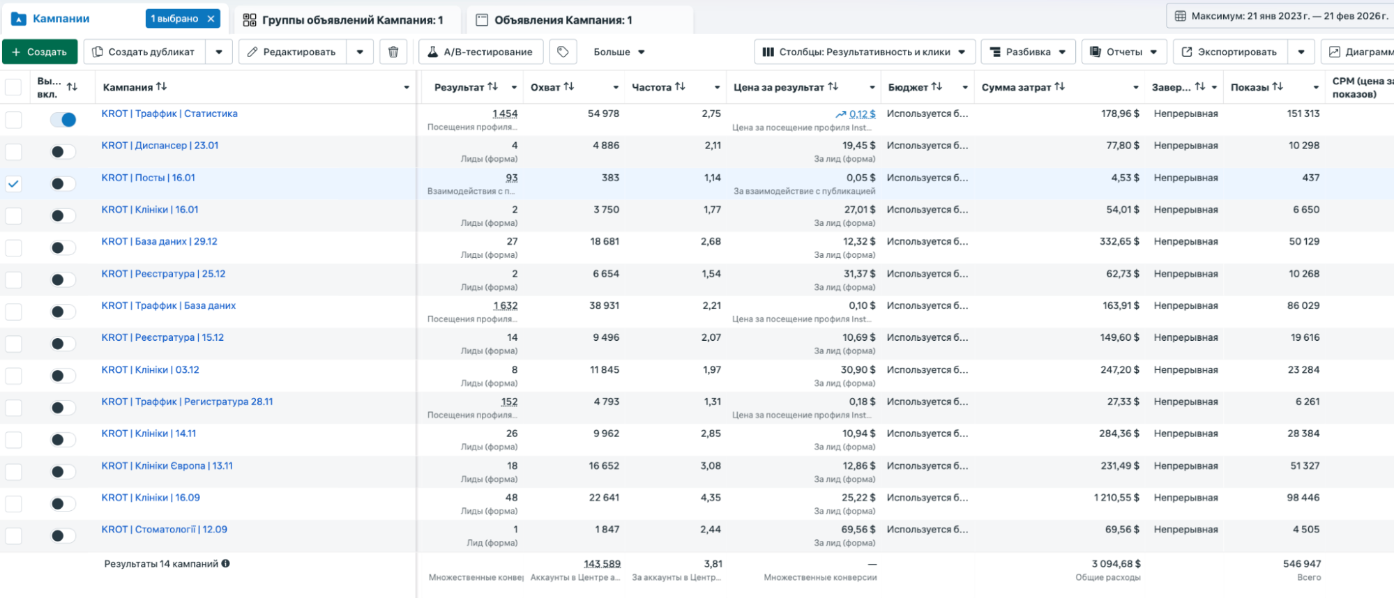 Запущенные рекламные кампании Lead Generation + Engagement + Traffic