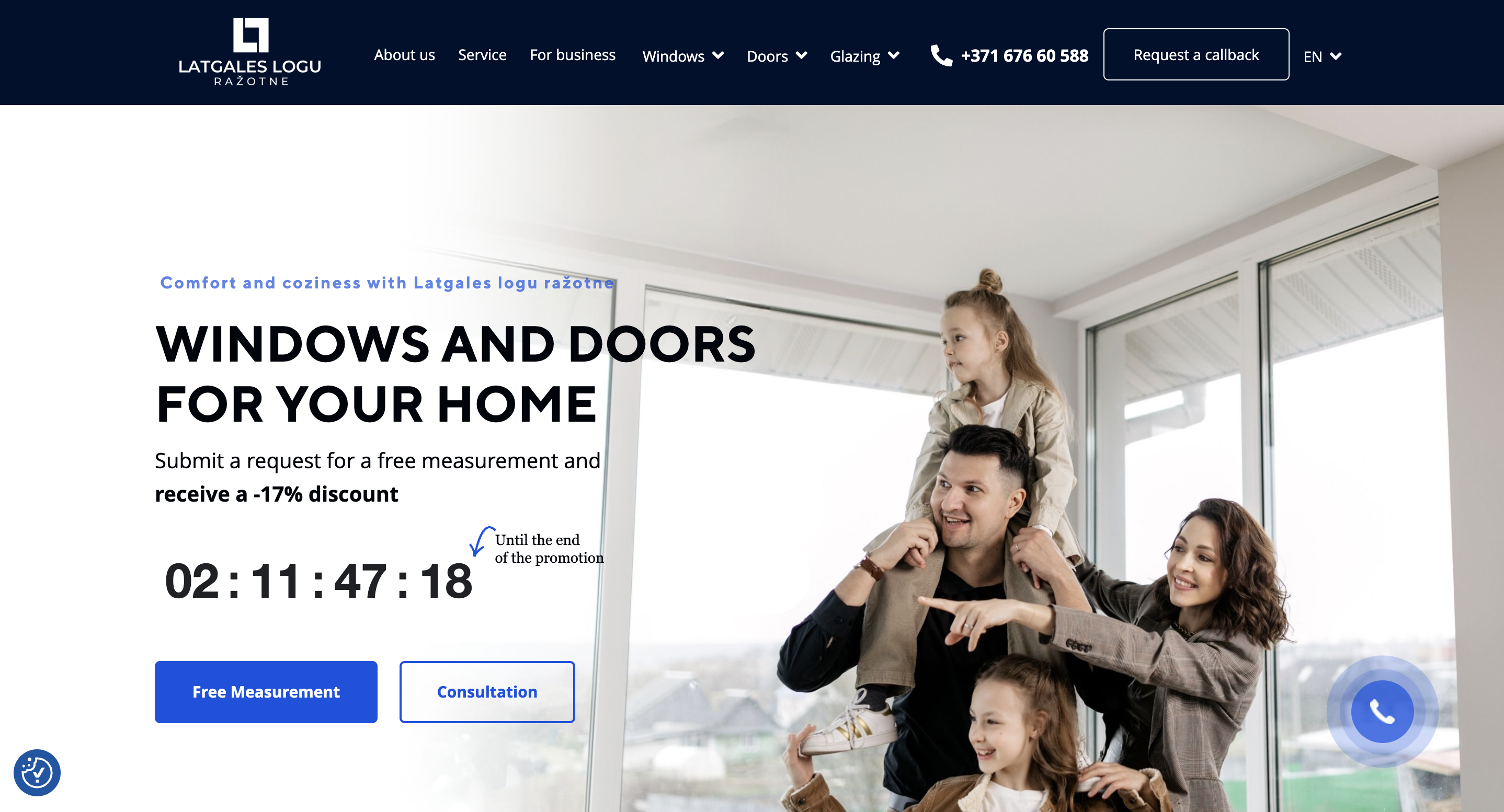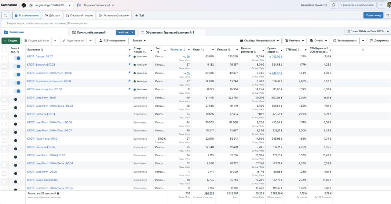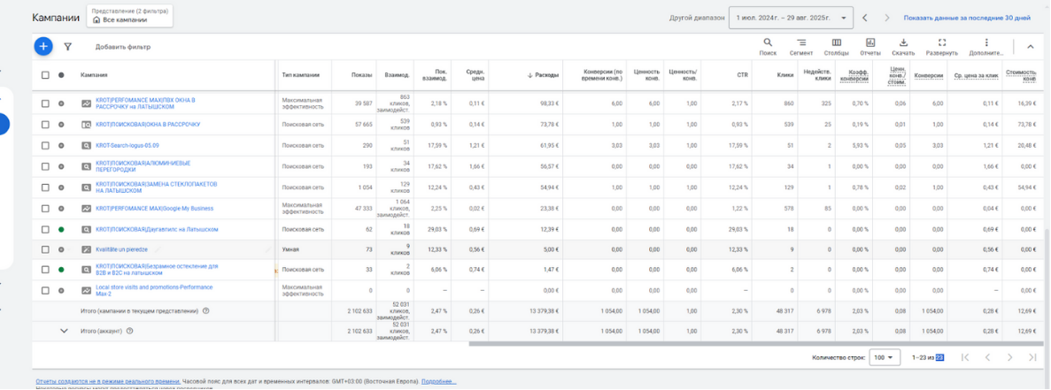 Запуск поисковых кампаний по окнам на латышском и русском языках по окнам. Запуск баннерных рекламных кампаний Performance Max на латышском, русском языках по окнам.