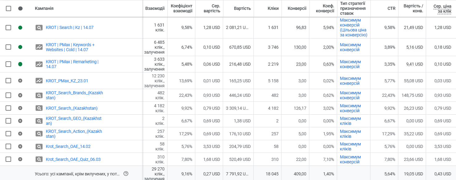 Оптимізації: Чистка пошукових запитів, додавання мінус-слів на рівні кампанії або облікового аккаунту, збір конверсійних ключових слів, видалення нерелевантних місць розміщень, перехід на автоматичні стратегії на позначення ставок під ROAS.
