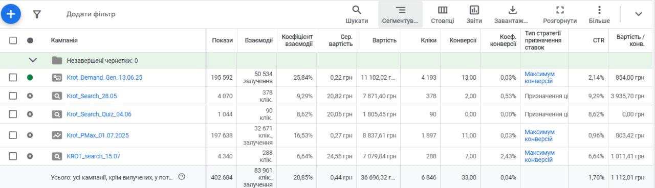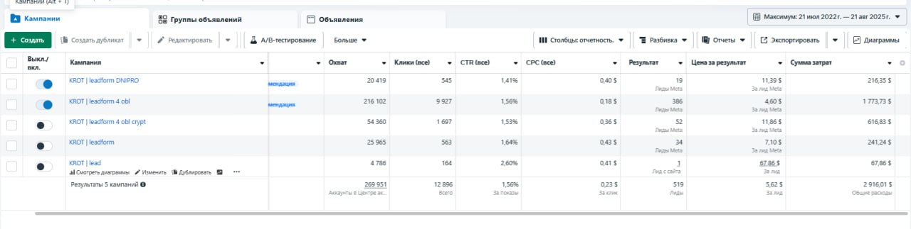Запущены рекламные кампании Lead Generation + Brand Awareness, Conversion + Traffic, Lead Generation + Engagement.